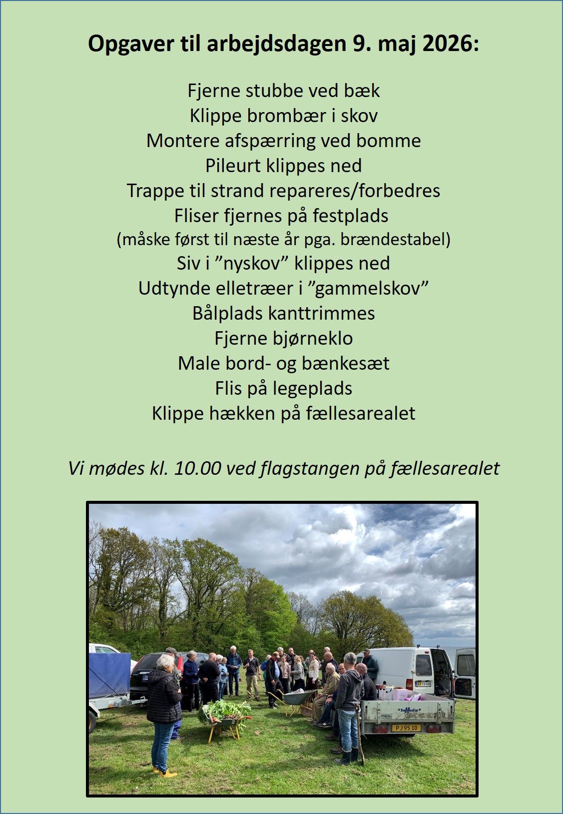 9. maj 2026 er der arbejdsdag i kolonien. Vi mødes ved flagstangen på fællesarealet. Planlagte arbejdsopgaver:
